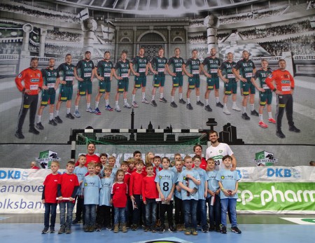 Bild: Die Einlaufkinder, Betreuer und mitgereisten Gastkinder der HSG Lengede/Gadenstedt zusammen mit dem Recken- und Nationalspieler Fabian Böhm
