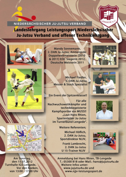 Am 15.07.2012 hatte der Turnerbund Lengede hochkarätige Ju-Jutsu Referenten zum Nachwuchslehrgang Leistungssport Ju-Jutsu und zum offenen Techniklehrgang „Waffen“ zu Gast. 111 Teilnehmer (28 mehr als angemeldet) folgten der Einladung und wurden im Ju-Jutsu Fighting von der amtierenden Doppelweltmeisterin Mandy Sonnemann, dem Sportdirektor des Niedersächsischen Ju-Jutsu Verbandes (NJJV) Michael Höflich und U15 Trainer Frank Lambrecht (NJJV) unterwiesen. Die Techniker wurde von Michael Fiedler, 5. Dan Ju-Jutsu in Stock-, Doppelstock- und Messerabwehrtechniken unterwiesen.