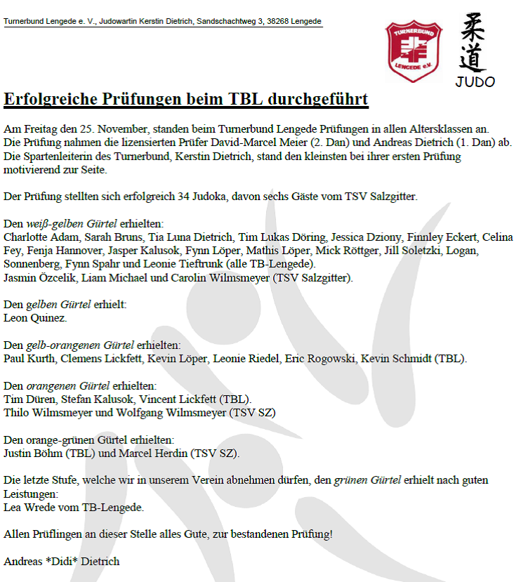 Judo: Prüfungen am 27.11.2016